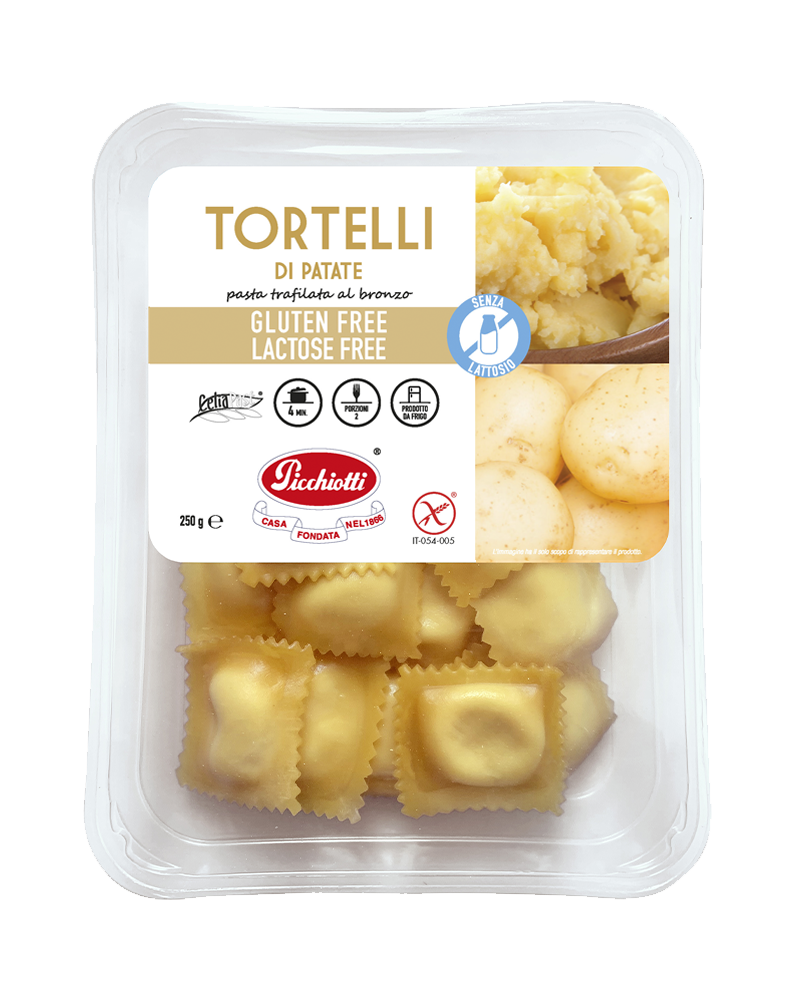 SFOGLIA (60%): Preparato per pasta senza glutine [amido di mais, fecola di patata, farina di riso, farina di grano saraceno, fibre vegetali (mais, pisello, psyllium), estratto di lievito, gomma di guar (E412)] uovo 24%, acqua, olio extravergine di oliva, aromi naturali. RIPIENO (40%): Purea di patate 24%, uovo, PARMIGIANO REGGIANO (latte vaccino, sale, caglio animale); PANE GRATTUGIATO (farina di mais, zucchero caramellato, sale); SALE, FIBRA VEGETALE (fibra: bambù, sale, aroma naturale, olio di girasole), AGLIO, NOCE MOSCATA, SALVIA, PEPE.Può contenere tracce di: pistacchio, sedano e soia.